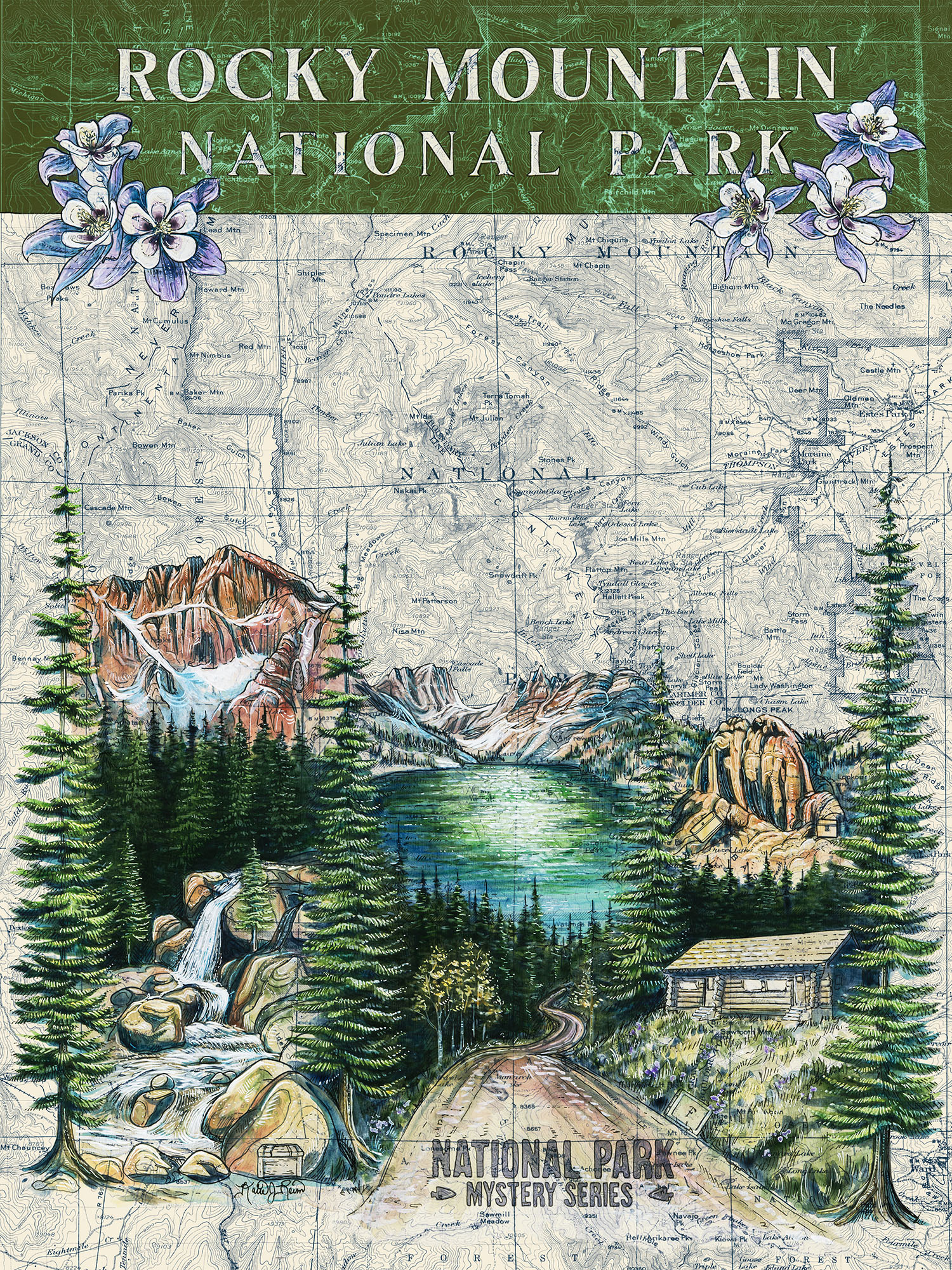 - Locations from the book are featured in the artwork: Longs Peak, Emerald Lake, Twin Owls, Willow Park Patrol Cabin, Alberta Falls, and Fall River Road.